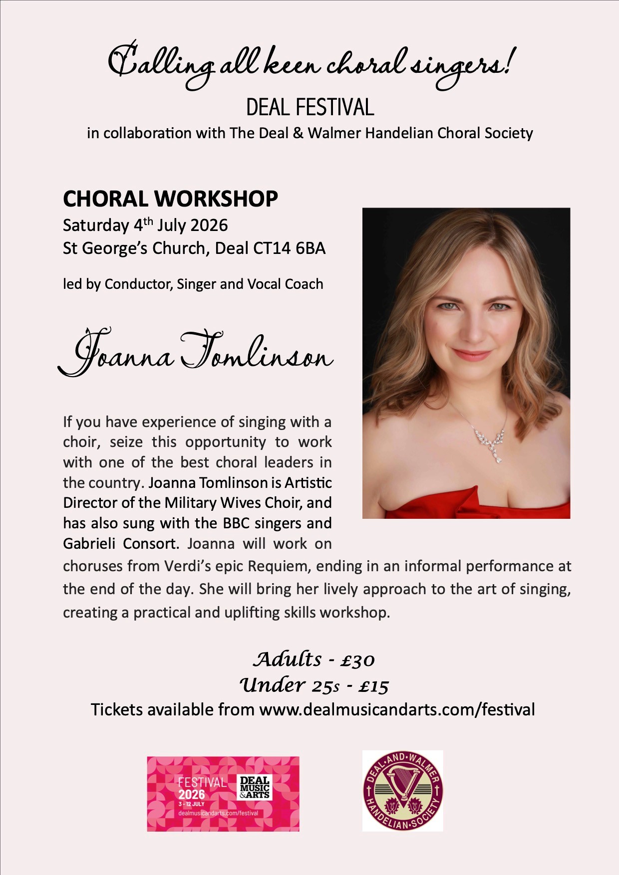 As part of the Deal Festival, The Handelians will co-host a singing workshop with renowned vocal coach and conductor Joanna Tomlinson. She will work on choruses from Verdi’s epic Requiem – this is likely to be a popular event and early ticket purchase is advised.